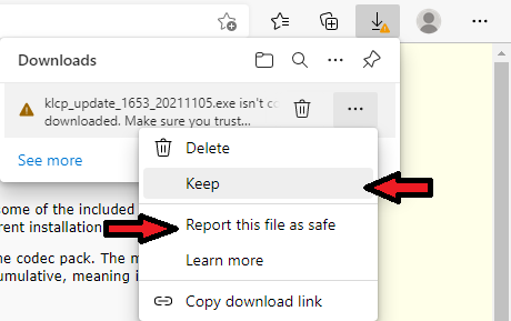 | How to bypass Windows Edge SmartScreen Download FilterThe Microsoft Edge browser can block downloads that point to very new files. It will say that "the file may be potentially harmfull" because it is unknown and has not yet been downloaded many times. This message does not mean that the file is bad or unsafe! It only means that the file is new and they have not yet analyzed it. Files have to be downloaded several thousand times to build "reputation" before the warning is removed. The warning is very annoying and you may get your download blocked if you try to download any of our files shortly after we release new versions. A better way to ensure a file is safe to use is to scan it with VirusTotal. This will scan a file with more than 60 different antivirus scanners. Here is how you can unblock your download. Look at the red arrows where to click.